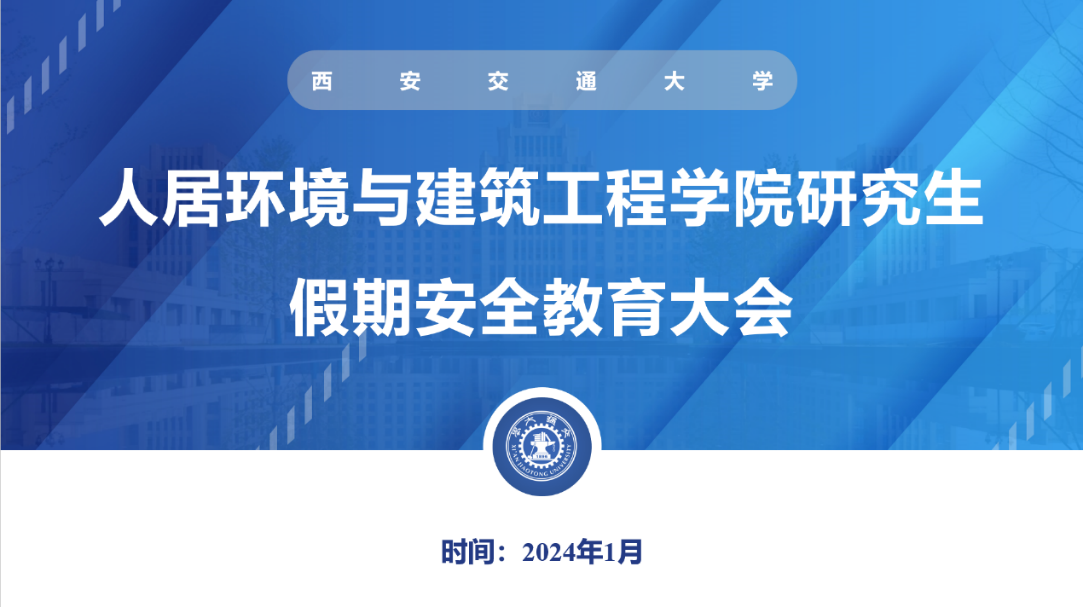 1月25日,人居学院召开研究生安全教育大会,学院党委副书记王新轲传达了学校近期关于校园消防安全工作的会议精神,为全体研究生作校园安全教育专题辅导报告,并对学院研究生寒假消防安全专项排查工作进行了部署。他强调,春节是万家团圆的温馨时刻,幸福的底色是“安全”,安全意识决不可松懈,要牢固树立安全第一、预防为主的思想,增强自我保护意识,确保自身安全,度过一个安全健康、快乐幸福、有所收获的假期,以积极心态和昂扬风貌迎接下一个学期的到来。