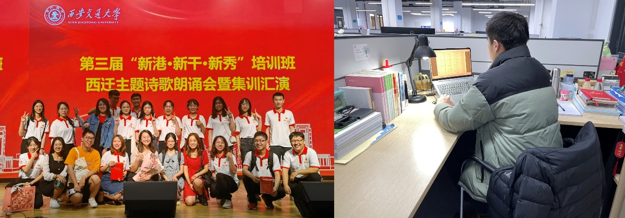 2021年秋,余恩得作为新生骨干参加了学校第三届“新港·新干·新秀”培训班,在为期两周的理论培训与实践研学中,他对交大的西迁历史、创新港的内涵建设有了全面的认识,对交大学子的使命担当有了全新的理解,“新时代的交大青年,要以传承和弘扬西迁精神为己任,善于创新、不懈奋斗,为学校建设和西部发展添砖加瓦”。余恩得始终勤勉求学,研究生学业成绩位列专业第二,累计获优秀研究生干部、优秀共青团员、特等学业奖学金、激智二等奖学金等表彰奖励10余项。