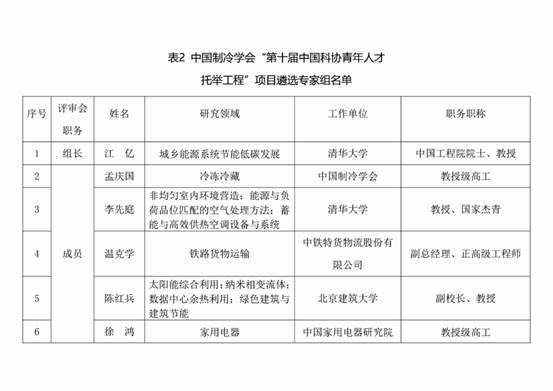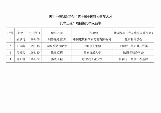 经提名、形式审查、函评、终评等环节遴选,中国制冷学会拟推荐战斌飞(中国建筑科学研究院有限公司)、王佳韵(上海理工大学)、关博文(西安交通大学)、唐天琪(哈尔滨工业大学)4名被托举人入选中国制冷学会“第十届中国科协青年人才托举工程”支持名单。被托举人及遴选专家组名单见表1、表2。