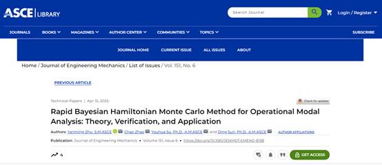 该研究成果以Rapid Bayesian Hamiltonian Monte Carlo Method for Operational Modal Analysis: Theory, Verification, and Application为题,发表于美国土木工程师协会(American Society of Civil Engineers, ASCE)权威期刊《工程力学杂志》(ASCE Journal of Engineering Mechanics)。工程力学杂志创刊于1875年,为应用力学领域最古老、权威的期刊,论文通常建立分析模型、创新数值方法以及新颖实验方法和结果的开发和实施。该论文为近年来西安交通大学土木工程学科在该刊发表的首篇论文,西安交通大学是该论文的唯一作者单位,论文的发表标志着团队在应用力学领域取得了突破性进展,该研究工作得到了国家自然科学基金等项目的共同资助。