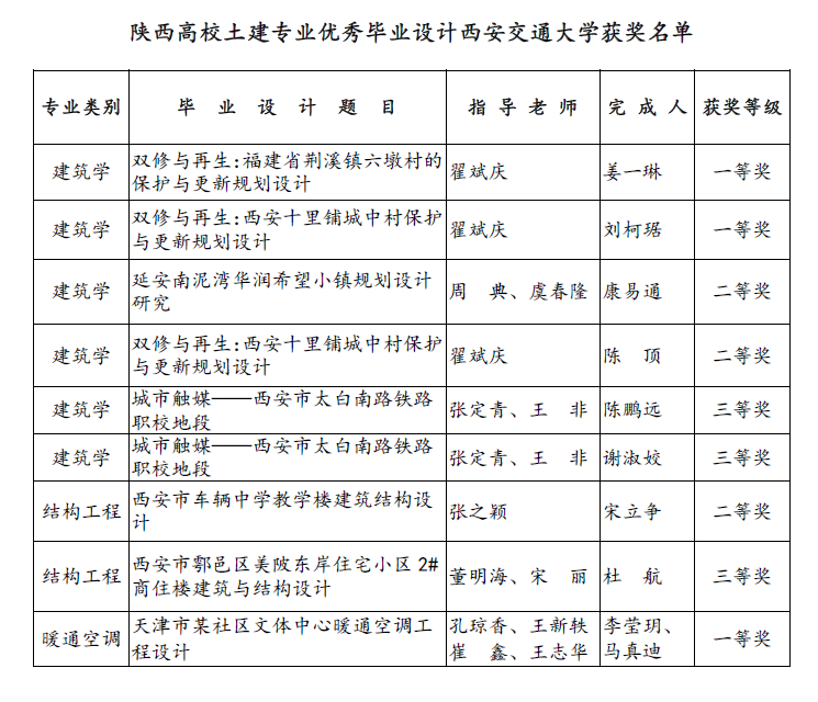 近日,2018年(第24届)陕西高校土建专业优秀毕业设计评选结果公布。人居环境与建筑工程学院作品获得佳绩,申报项目9项,分别斩获一、二、三等奖各3项。