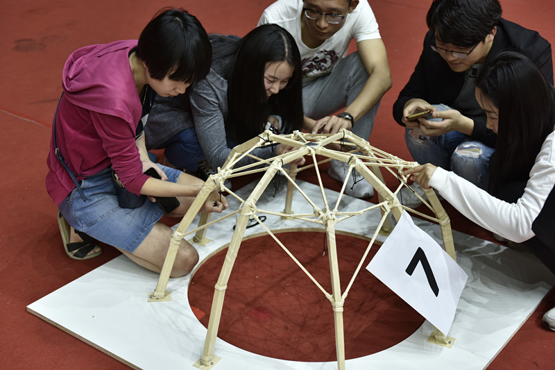 经过紧张激烈的加载过程,下午6时,所有队伍完成比赛。根据各队计算书、模型制作、现场表现和承载力的得分计算出总成绩,最终确定了比赛结果。本次竞赛中,多支队伍的设计作品都充分发挥了材料性能,构件传力明确、结构布置合理,结构所能承受的重量达到自重的一百倍以上。在闭幕式上,人居学院书记杨鹏、航天航空学院副书记陈永华、人居学院副院长张硕英分别为获得一、二、三等奖的队伍颁奖。