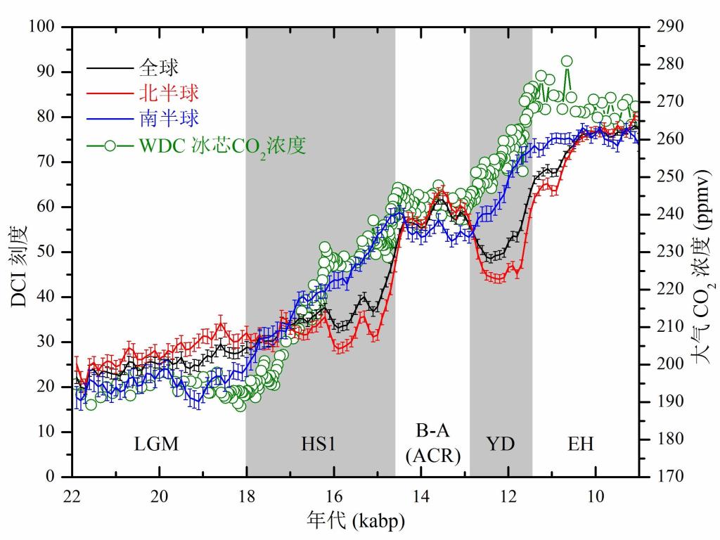 为了更好地捕捉大区域范围气候变化趋势转折点的时间信息,西安交通大学人居学院博士生刘植在导师黄少鹏教授的指导下,收集整理了全球范围内的88条具有良好年代标尺的高分辨率古气候记录。利用数据归一化和移动平均集成方法,重建了全球和南北半球尺度上22000至9000年前之间的气候变化过程。通过与利用南极冰芯最新建立的百年分辨率大气CO2浓度变化结果进行突变点识别检验和对比,发现末次冰消期发生初始变暖时间明显早于大气中CO2浓度的初始上升时间,表明大气CO2浓度并非是末次冰消期全球变暖的驱动因素,而是地球系统内部的反馈环节。在冰消期的中、后段,二者的时序关系显示出同步变化的趋势,反映了它们之间一种快速的耦合关系,可能与南大洋在将储藏在深海中的大量CO2释放到大气中的同时,也将海洋中的大量潜热交换至大气中有关。