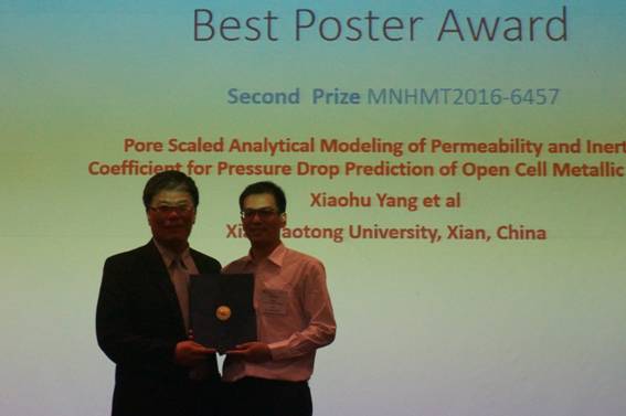 人居学院青年讲师杨肖虎进行了主题为“Pore-Scaled Analytical Modelling of Permeability and Inertial Coefficient for Pressure Drop Prediction of Open-Cell Metallic Foams”的学术海报展示。该项研究的主要内容为:首先对开孔泡沫金属微观结构进行分析并建立物理模型,通过数学计算得到该泡沫金属的渗透率和惯性系数的解析解,进一步预测流体穿过该泡沫金属所产生的压降,并将计算得到的解析解与实验数据进行了对比。开孔泡沫金属由于其比表面积大、强度高、传热性能好等优点在多个领域都有应用,但流体穿过泡沫金属的压降问题仍然是阻碍其实际应用的一个重要方面,该项研究思路新颖,模型预测值准确度高。杨肖虎讲师的学术海报排版精致、内容新颖,得到了会议组织方和与会学者的一致认同,最终获得了会议最佳海报二等奖。