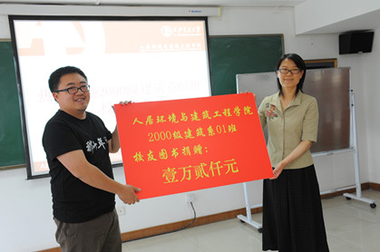 原2000级建筑系01班班长胡高荣,代表班级对学院的热情欢迎表示感谢,同时代表班级向建筑系捐赠价值12000元的书籍。并表示校友们愿意以此为起点,为学院的不断发展贡献自己的力量。