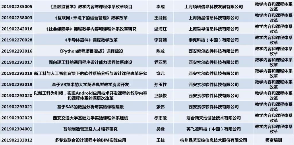 2019年教育部第二批产学合作协同育人项目共有916所高校的8211个项目入选。西安交大此次获批的49个项目,获得了华为技术有限公司、深圳市腾讯计算机系统有限公司、微软亚洲研究院、北京奇虎测腾科技有限公司、科大讯飞股份有限公司、广州中望龙腾软件股份 有限公司、西安索尔软件科技有限公司、北京象新力科技有限公司、新道科技股份有限公司等37个国内外知名企业的支持,校企合作致力于新工科建设、教学内容和课程体系改革、创新创业教育改革、师资培训、实践条件和实践基地建设。