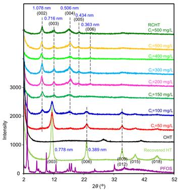 针对现有技术中存在的问题,张博翔老师团队合成了一种水滑石,该水滑石不但成本低,而且对PFOS污染物的去除效率高,解决了处理全氟辛烷磺酸盐(PFOS)的两大难题。并与2020年10月9日发表发明专利《一种水滑石及其制备方法和水滑石在吸附水体里PFOS污染物中的应用》,专利号【201910798396.1】。该发明专利阐述了该高效吸附的水滑石的制备方法和其在吸附PFOS的应用。同时该团队研究发现全氟辛烷磺酸最初是在CHT的外表面被吸附的,随着装载水平的增加,全氟辛烷磺酸的嵌入导致结构从3R多型变为1层堆叠结构。通过XRD、热重分析仪和傅里叶变换红外光谱分析证实了全氟辛烷磺酸的插层作用,插层作用使全氟辛烷磺酸的分解温度从513℃降低到443℃。在450℃下再次烧结后,废CHT可以再生以达到相同的效果。