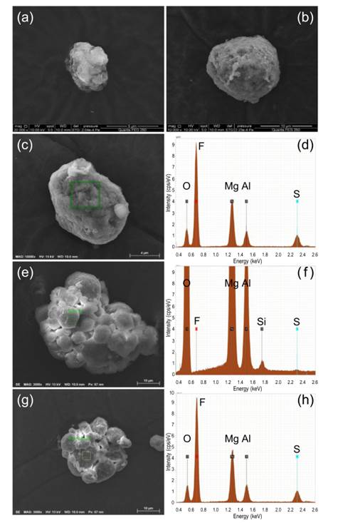(a)烧结水滑石第一次吸附500 mg/L的PFOS后的SEM影像以及(b)EDS成分分析图谱,氟和硫元素成分表明了PFOS被成功吸附在烧结水滑石上。(c)和(d)分别为将(a)图的烧结水滑石再次烧结到600度后的SEM和EDS成分分析图谱,可以看出没有氟和硫元素存在,表征PFOS已高温崩解从烧结水滑石上被移除。(e)和(f)为将(c)图的烧结水滑石再次吸附500 mg/L的PFOS后的SEM影像以及EDS成分分析图谱,(e)仍可见层状结构,EDS图谱再次出现氟和硫元素成分,表征再次吸附成功,可见水滑石具备再生能力,为一良好可重复使用的材料。