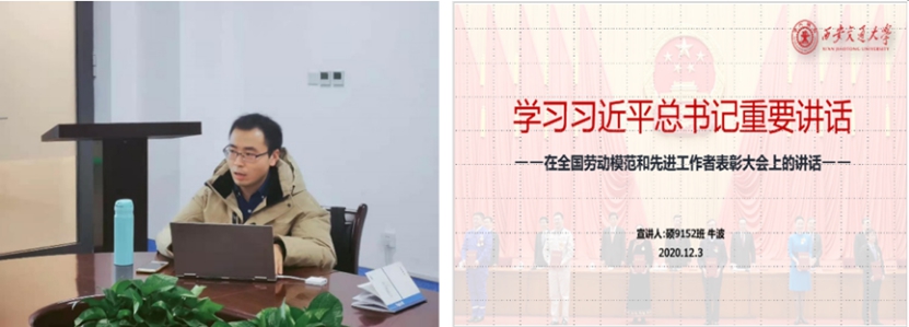在支部《学习习近平总书记系列重要讲话》学习专题中,宣传委员牛波带领支部成员学习习近平总书记在在全国劳动模范和先进工作者表彰大会上的讲话,并就“如何成为劳模”以及身边交大人——“全国先进工作者”郑南宁院士、施秉银教授作深入解读与介绍。通过集体学习,深化对劳模精神、劳动精神、工匠精神的认识,用劳动模范和先进工作者的崇高精神和高尚品格鞭策自我,争做脚踏实地、锐意创新、勇于担当、无私奉献的新时代青年。