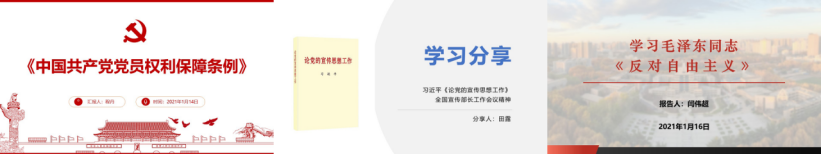 支部组织委员程丹领学《中国共产党党员权利保障条例》,她指出,要深入领会《条例》精神,正确认识和处理权利和义务、责任和担当之间的辩证统一关系,在行使好党员权利的同时,积极有效履行好党员义务,时时处处发挥好党员先锋模范作用;宣传委员田露领学习近平《论党的宣传思想工作》和全国宣传部长会议精神,她表示,宣传思想工作要增强政治敏锐性,牢牢掌控意识形态主导权,把握好舆论方向,宏观宣传要有底气,中观宣传要接地气,微观宣传要聚人气,从根本上发挥引领和带动作用;纪律委员闫伟超领学《求是》杂志文章《学习毛泽东同志<反对自由主义>》,他强调,我们要做政治上的明白人,把对具体工作的落细落实体现在一点一滴的行动上,做到反对形式主义、提倡务实做事,反对自由主义、提倡令行禁止,反对学做不一,提倡知行合一。全体支委轮流诵读人民日报长篇通讯《风卷红旗过大关——以习近平同志为核心的党中央领航中国为实现第一个百年奋斗目标而奋勇拼搏纪实》中的“开‘顶风船’”“啃‘硬骨头’”“谋‘大棋局’”“扩‘朋友圈’”“筑‘同心圆’”五个章节。