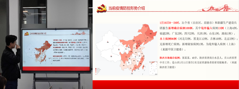 会议第二项议程,高一杰同志强调寒假期间疫情防控注意事项。他从当前疫情形势、各地防控政策以及疫情防控知识三方面给大家提出建议。他强调,支部同志同学们在返乡返校过程中要严格遵守国家及学校的相关规定,积极配合相关防疫工作的展开,在疫情隔离期间关注自身身体健康及心理健康。