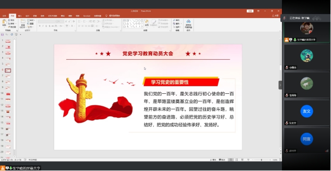会议伊始,张学峰同志从党史学习教育的重大意义、党史学习教育的重点和工作要求等方面带领大家学习了党史学习教育动员大会的主要内容。郭瑾萧、卢靖、包艳艳同志分享了学习心得。郭瑾萧同志表示,作为一名党员,要对党的历史深学细悟,练就过硬本领,从党史中汲取坚定初心信仰的精神力量,并把这个力量投入到日常的工作和学习中,为人生注入激情动力。包艳艳同志认为,党史学习教育能够对全体党员进行深刻的思想洗礼,有利于教育引导广大党员干部进一步坚定理想信念。作为一名学生,我们也要更加深入的学习了解党史,做到知史爱党、知史爱国,感悟践行自己的初心使命;在做好学业工作的同时,也要增强自身责任意识,肩负起应该承担的责任,为祖国未来的发展尽一份力。