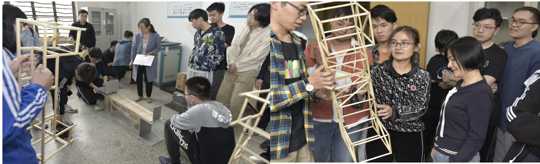 本次竞赛题目是《单跨桥梁结构设计与模型制作》,竞赛分为主、辅两个赛道,主赛道采用竹材制作模型,根据模型质量、结构尺寸、加载表现、现场陈述、计算书质量等,模型轻、荷载比大小是获胜的关键。辅赛道根据理论方案、展板质量、现场陈述、答辩表现等确定成绩。经过紧张激烈的角逐,航天学院蔡储祥、林撼昕、李博强同学获得主赛道比赛特等奖,一等奖获得者是能动学院李继言、刘平和机械学院刘平同学和人居学院高喆、陈新艺和王清同学。另评出二等奖4项、三等奖7项。能动学院王浩明同学获得辅赛道A组一等奖,人居学院刘少华和陈轩翌同学获得辅赛道B组一等奖,另评出二等奖2项。