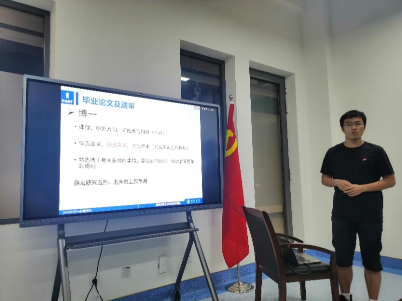 会议第二项,贾国圣师兄以未来工作意愿作为个人导向,以毕业条件作为必要标准,进行博士阶段规划经验与个人体会分享。他提到:“博一入学是非常关键的时期,应熟悉博士期间要做的事情,要达成的目标,以此制定后面三年的学习规划。”此外,贾国圣师兄还分享了毕业要求、论文写作等经验,鼓励大家要对博士生活充满信心,对科研充满热情,同时还要坚持锻炼身体,才能更高效的完成博士阶段的各项任务。