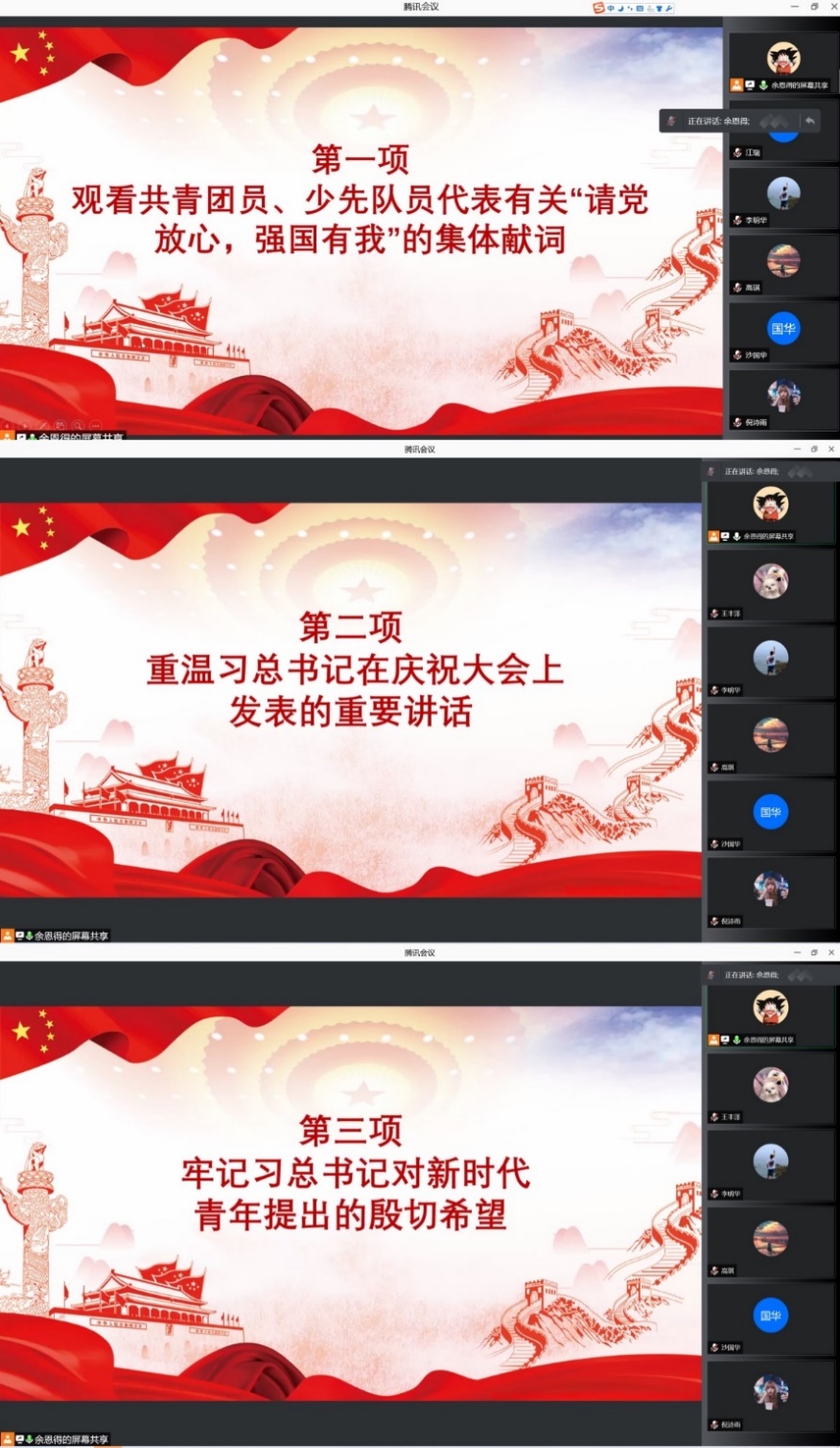 会议第一项,支部成员共同观看共青团员和少先队员代表集体致献词视频。在庆祝中国共产党成立100周年大会上,共青团员和少先队员代表四次高喊“请党放心,强国有我”,在献词中回望中国共产党的百年历史,感悟着党的初心和使命,面向天安门城楼,对党许下青春的誓言——新的百年,听党话、感党恩、跟党走。为实现第二个百年奋斗目标、实现中华民族伟大复兴的中国梦,为共产主义事业奋斗,时刻准备着。
