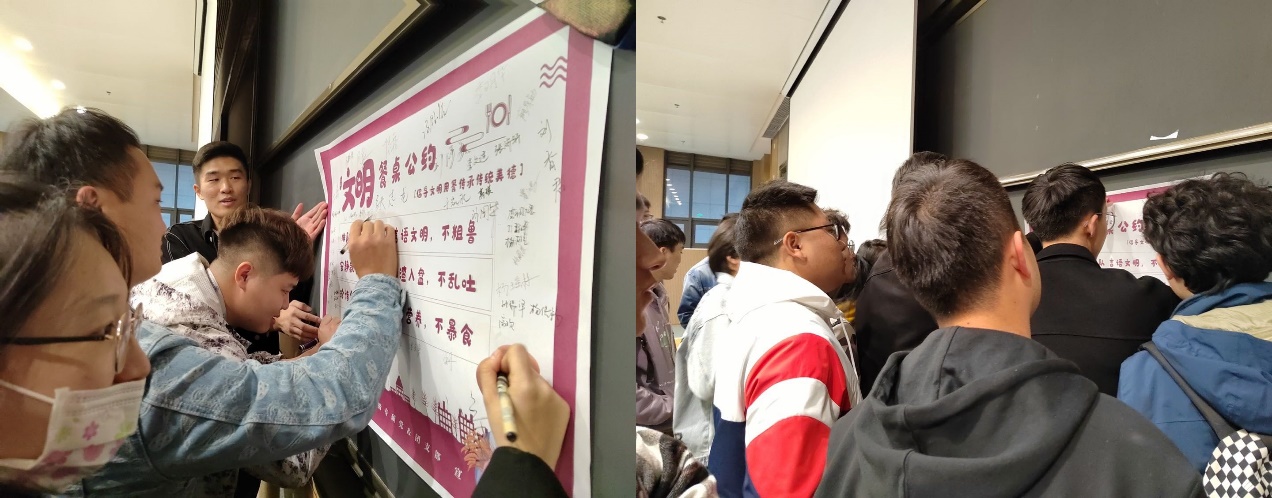 我支部为提前做好11月份校组织的“文明餐桌”志愿活动,2021年10月22日晚,本支部召开“文明餐桌”志愿活动动员大会,支部书记余恩得同志向班级各位同学宣讲了本次志愿活动的原则和精神,支部成员在充分了解之后,纷纷在“文明餐桌”志愿活动的海报上签下了自己的名字,以表示自己的决心。