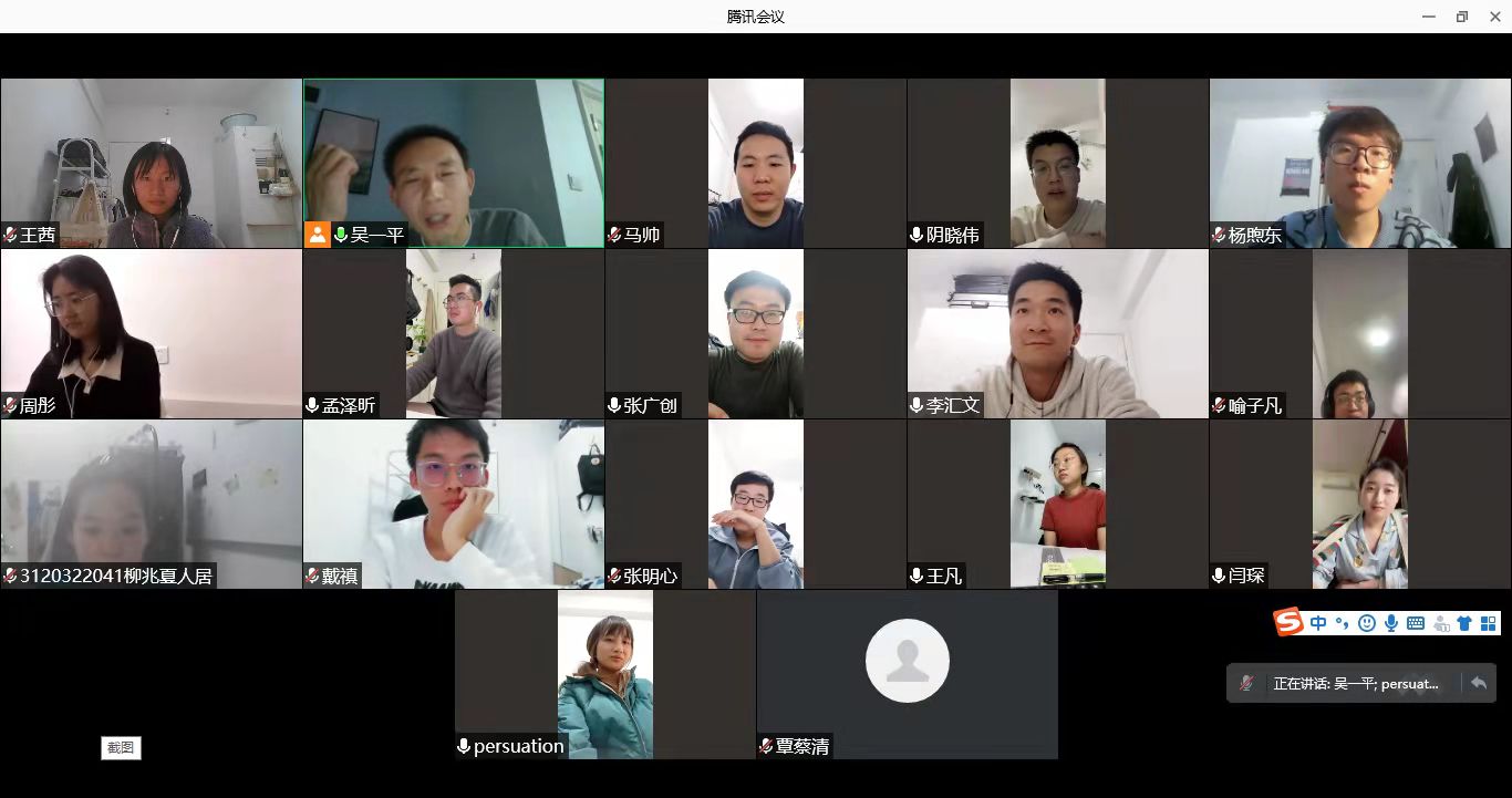 临近年末,突如其来的新冠肺炎疫情让人措手不及。当前,西安市疫情防控形势仍然严峻复杂。为最大限度减少人员流动,从27日零时起,进一步强化全市疫情防控措施。疫情袭城打破了大家正常的生活秩序,也给同学们带来了一定的心理负担。值此特殊时期,12月29日晚吴一平教授召集了研究生开展生活、科研交流座谈会,与同学们交流近期研究之路,旨在让同学们“在研究中发现问题,在问题中研究,在研究中成长”。首先,由吴一平教授总结了近期团队的工作的成绩与不足。接下来,分年级进行近期工作汇报交流。最后,由吴一平教授对大家接下来的科研工作做出了规划与部署。对研究生提出了要“培养组内各成员之间的协作能力与团体凝聚力,坚持科研与运动并进”的居家工作形式。鼓励大家要正确看待疫情,树立正确的心态,积极应对!