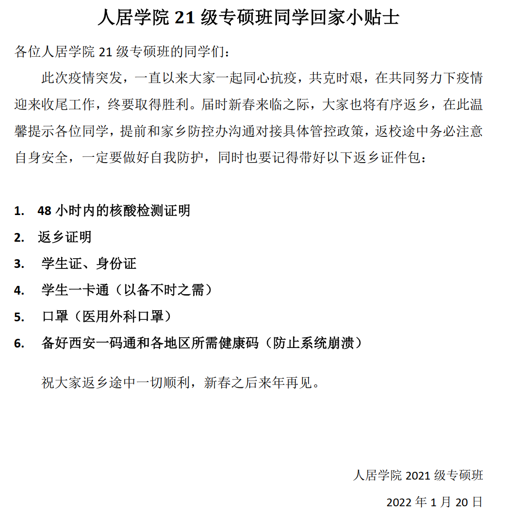 疫情防控人人有责,疫情尚未结束,我们绝不能放松警惕,依然要加强防范,做好个人防护。最后,祝老师和同学们度过一个平安愉快的春节和寒假!