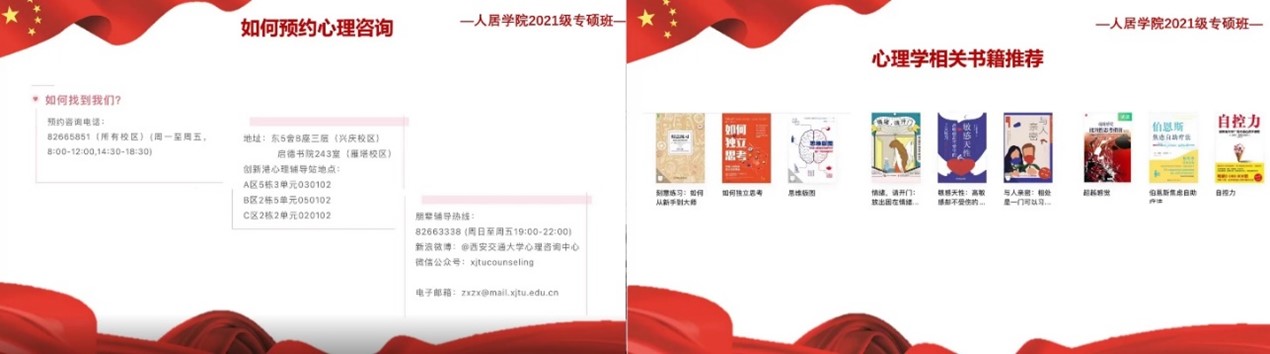 会议伊始,为积极响应上级“心理健康月”活动号召,引领研究生关注自身心理状况,提升心理健康素养,引导大家认识自我、接纳自我,关注自我心灵的健康。由心理委员王文溪向同学们介绍有关心理健康的书籍以及预约心理咨询中心的方法,并鼓励同学们走进心理,拥抱心理健康,以正确的方式释放压力,以合适的手段发泄情绪,以积极乐观的态度笑对生活。