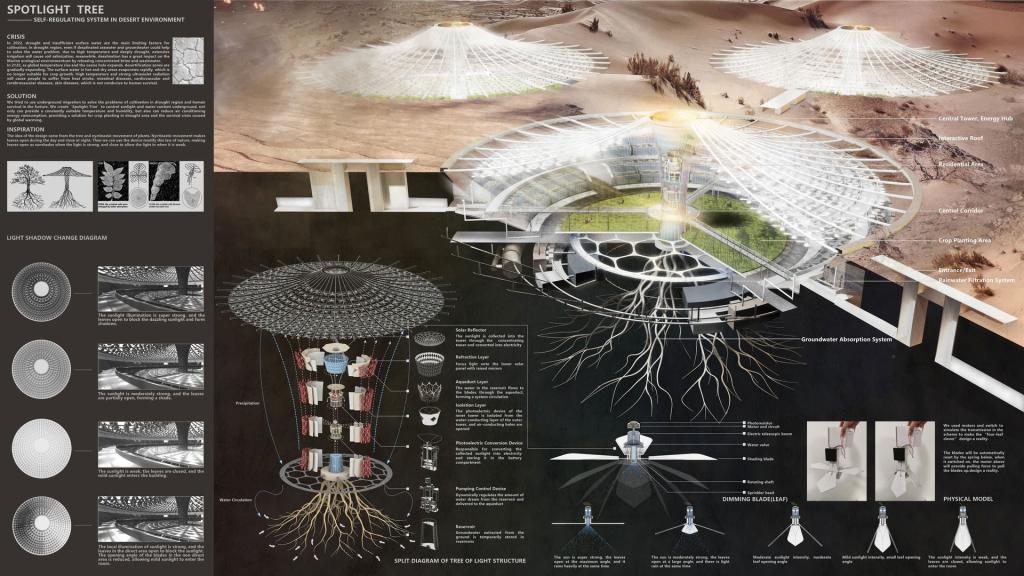 作品“SPOTLIGHT TREE(光树)”构建了以“光树”为技术核心的地下城乡空间,以应对未来可能面对的极端太阳辐射。光影变幻,日光调节,“叶片”仿生植物感夜运动,可随日光绽放与收拢;低碳循环,气候舒适,“树干”集成了太阳能集热系统、自动喷淋系统、水循环系统等7层装置系统。设计还配套构建了包含居住空间、农田、交通网络等在内的地下城乡空间,为未来极端太阳辐射下的人类生存危机提供解决思路。大赛评委德国建筑师Rainer Hofmann评价道:“The jury chose this project because it's a sort of unique answer to a dystopic world.(评审团选择了这个项目,因为它是对反乌托邦世界的一种独特回答。)”