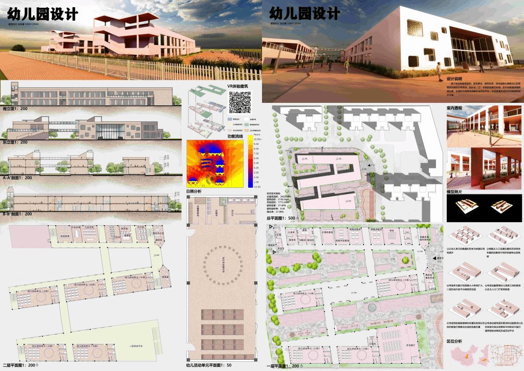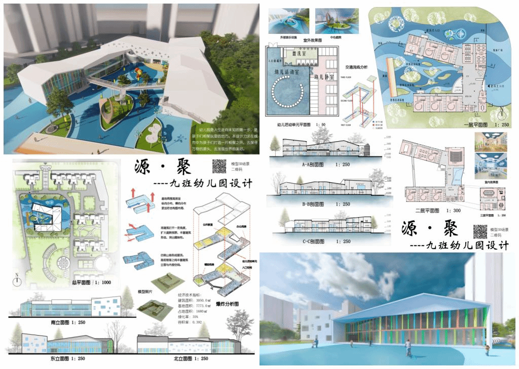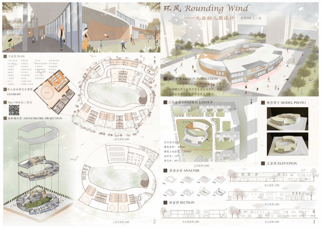 设计说明:幼儿园是孩子们相聚玩耍的地方。本设计从北方传统合院中获得灵感,并结合基地情况将体块进行扭转变化,同时从屋顶入手,塑造丰富且统一的形体,力求在城市中为孩子们打造一片相聚之所,去探寻万物的源头,去发现世界的美好。