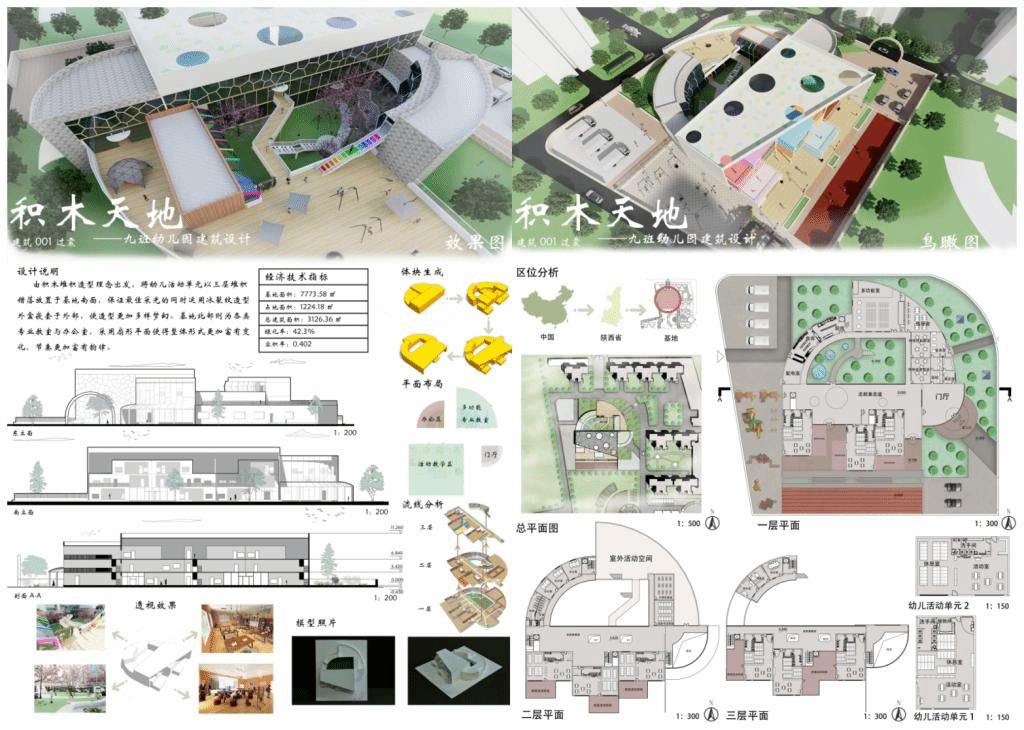 设计说明:由积木堆积造型理念出发,将幼儿活动单元以三层堆积错落放置于基地南面,保证最佳采光的同时运用冰裂纹造型外盒嵌套于外部,使造型更加多样梦幻。基地北部则为各类专业教室与办公室,采用扇形平面使得整体形式更加富有变化,节奏更加富有韵律。