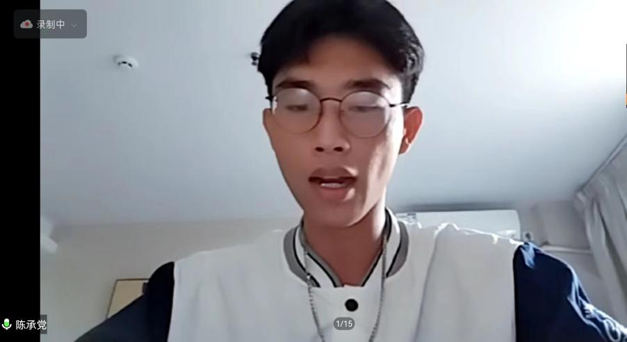 陈承党是来自海南的一名新生,线上与大家分享了他在学校隔离点的生活,对文治书院李尚宗老师和学长们给予的帮助和关怀表示感谢。他借用近现代文学家、教育家吴汝伦在《百字铭》中“且挨过三冬四夏,暂受些此痛苦,雪尽后再看梅花。”来激励自己,热切地期盼着在人居学院的学习,在交大留下他人生中最浓厚的一抹色彩。