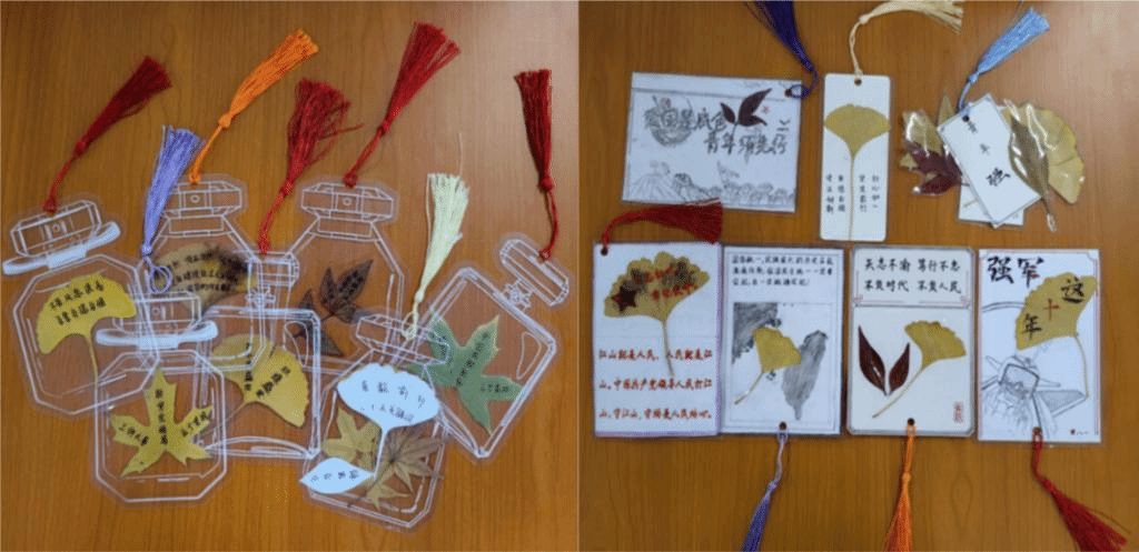 在本活动中,同学们以校园内落叶为主要元素,二十大关键词、金句为制作主题,利用塑封膜、流苏等材料进行自由创作。活动成员可在书签作品中任意挑选,匿名互换。