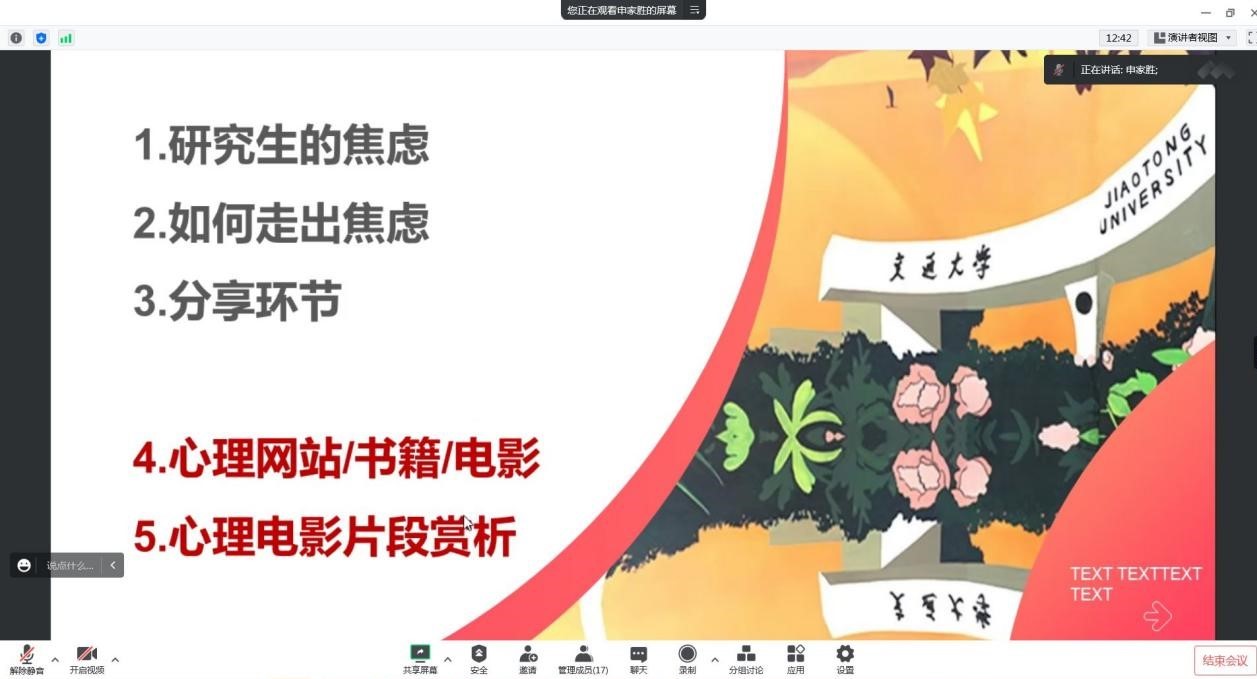 为进一步引导研究生识别压力来源,提升自我压力调节与情绪管理能力,人居学院硕2180班于2022年12月17日晚在腾讯会议召开了“正视压力,克服焦虑”主题班会。会议由心理委员申家胜主持。
