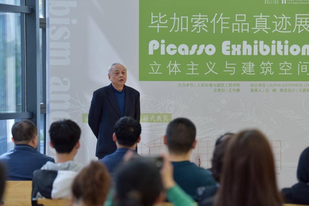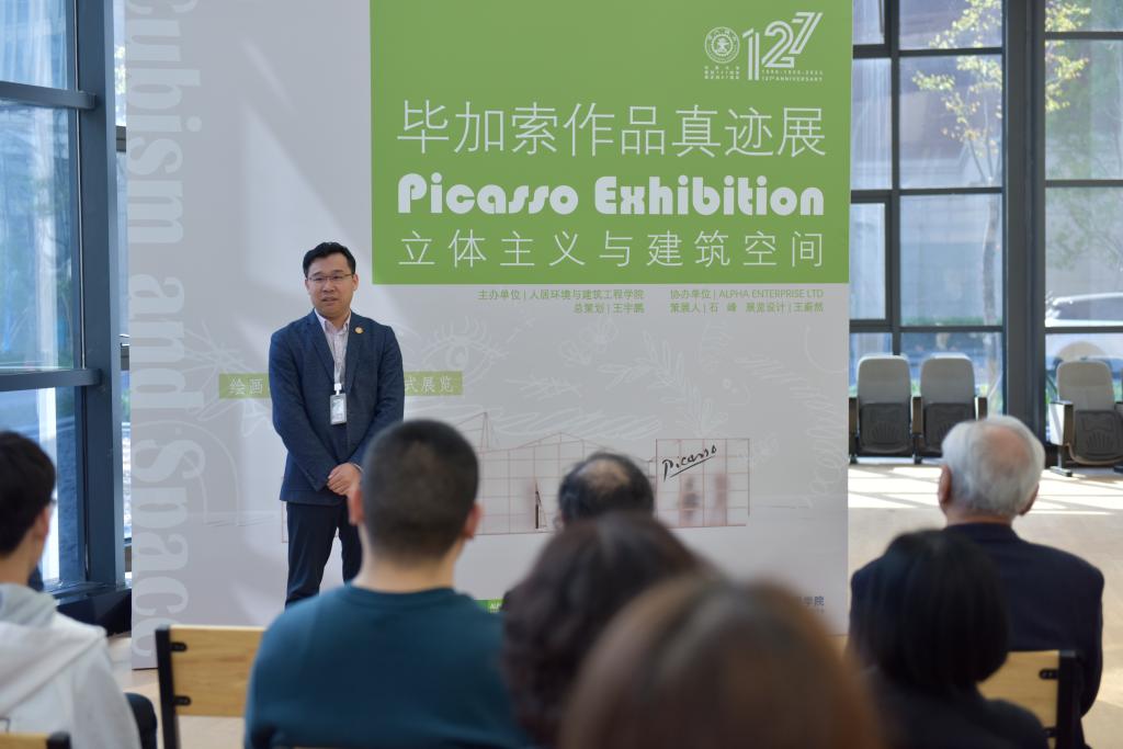 人居学院副院长、建筑学系教授周典讲话。他表示7号楼(源居楼)既是实验性建筑,又是产学研合作平台,该楼规划了建筑绿色节能系统,全面应用建筑光伏一体化,建成后将成为绿色建筑在高校园区应用的典范。绿色建筑代表着建筑发展的未来方向,拥有巨大的科研价值和发展潜力,将为人居学院未来学科发展提供巨大的支撑。打破传统、创新是毕加索作品的主要特点,希望以此活动为开端,建筑学系和人居学院师生能在创新中结出更多科研硕果。