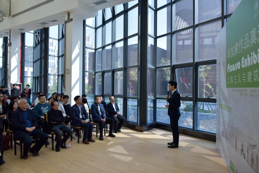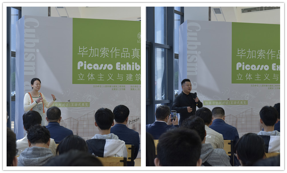 随后,此次展览策展人建筑学系石峰老师和建筑系本科生王蔚然同学为与会师生讲解了此次展陈设计的理念和观展方式。此次经过精心挑选的八幅毕加索真迹均为画家艺术生涯最盛期的作品,建筑学系师生运用“立体主义”和“立体主义房子”理念,通过门楣和三角形、棱柱等形状,打造非传统的全尺寸建筑模型,将作品置于模型装置中,让观展人穿行而过。并可在在建筑模型上,根据体验自行创作。互动式体验,让观展人全身心体验绘画与建筑艺术带来的美感享受。