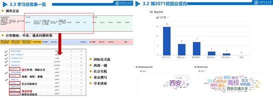 接下来,秦思宇和赵超分别从学业和就业的角度介绍班级科研和工作情况。在前期调研的基础上,针对大家遇到的一些问题,秦思宇梳理毕业主要学习任务,强调访学交流、基金撰写、社会实践、讲座报告等重要毕业环节,提醒和督促同学们及时完成相关内容。赵超结合前期班级就业意向调查情况,分析班级目前就业创业形势的主要特征,并梳理现存的问题及需求。