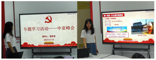 活动开始,由黄梦雪同学进行领学,通过全文学习的方式围绕“中亚峰会的国际历史背景”、“为什么在西安举行”、“中亚峰会的主要内容”、“中亚峰会的意义”、“中亚峰会对青年的启示”五个方面进行解读,聚焦习近平总书记提出的“四个坚持”和“八点建议”进行认真学习。