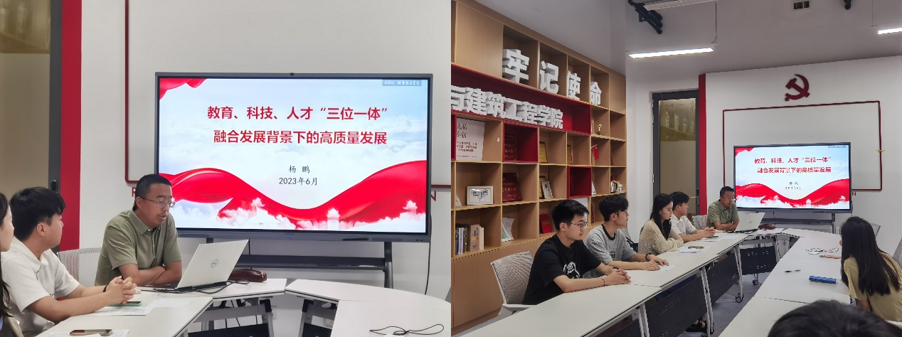 杨鹏以《教育、科技、人才‘三位一体’》为题讲授专题党课。杨鹏书记结合学院学科特色,从人才强国的重要意义、专业优化的方案原则、人才教育的培养方向三个方面深刻阐述了全面建设社会主义现代化国家,教育是基础,科技是关键,人才是根本。杨鹏书记始终强调,党的二十大报告指出,教育、科技、人才是全面建设社会主义现代化国家的基础性、战略性支撑。因此,各级学生党组织和广大学生党员要提高政治站位,自觉在思想上政治上行动上同以习近平同志为核心的党中央保持高度一致,增强大局意识,扛起使命担当。他通过宇航员费俊龙、工程师邹明、北斗卫星团队等奋斗者的故事,鼓励各位党员要努力学好专业本领,发挥专业专长,将个人成长融入到国家发展进程中,以实际行动投身到美丽中国的建设中,做有理想、有本领、有担当的青年人。