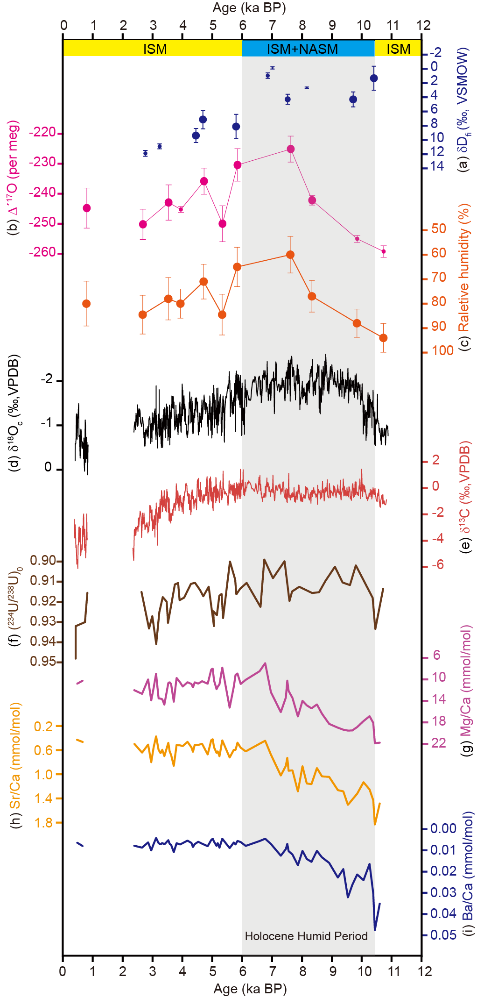长期以来,石笋碳酸盐氧同位素记录被认为可以反映季风区降水变化,从而进一步反映季风强度。但这一认识一直存在争议,在阿拉伯海地区,同样被认为可以反映印度季风变化的海洋记录与以石笋氧同位素为代表的陆地记录在岁差周期上存在明显的不同,被称作“海-陆岁差相位的困惑”。哪种记录才能真实反映季风变化?全新世阿拉伯海地区的气候状况以及印度季风是如何变化的?这些问题的答案并不清楚。