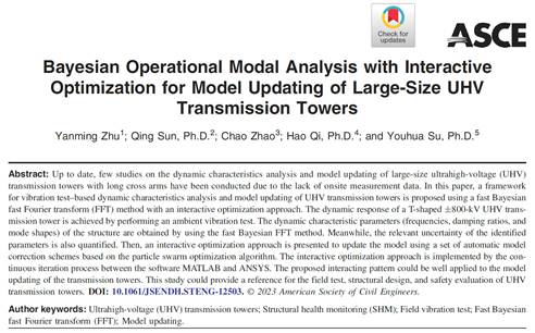 近日,美国土木工程师学会 (American Society of Civil Engineers, ASCE) 期刊Journal of Structural Engineering在线刊发了人居环境与建筑工程学院土木工程系孙清教授团队的论文——“面向大型特高压输电塔结构模型修正的贝叶斯运营模态分析与交互优化” (Bayesian Operational Modal Analysis with Interactive Optimization for Model Updating of Large-Size UHV Transmission Towers)。西安交通大学是该论文的唯一作者单位。该研究工作得到了国家自然科学基金(51978570)等项目的共同资助。