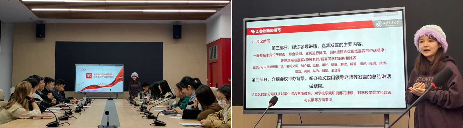 兼职辅导员陈思佳做宣传工作专题辅导报告,围绕人居学院宣传思想文化工作重要性及新闻稿撰写培训两个主题开展。通过对当前人居学院宣传工作总结,从现有工作短板和不足出发,指出接下来新闻工作应同深化理论武装、强化思想教育、讲好人居学院故事、发出人居青年声音、推进媒体融合发展等重点工作相结合。以“什么是新闻稿”“为什么要写新闻稿”两个问题导入主题,以会议新闻及活动新闻为例,介绍新闻稿文体特点、撰文思路及注意点,针对性讲解到如何减少口语化问题,从自身经验总结新闻稿拍照思路,希望同学们能够自觉承担起做好人居学院宣传思想文化工作的重大责任,不断加强和改进宣传思想文化工作,在今后的工作中以实际行动推动宣传思想文化工作高质量发展。