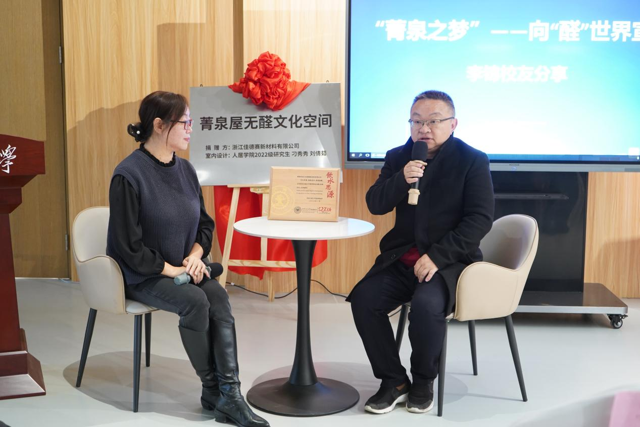 秉持饮水思源,回馈母校的理念,李锦校友为学校捐赠了“菁泉屋”无醛文化空间,该空间全面应用无醛化材料和无醛化整体交付的绿色环保创新技术,为师生、校友带来健康舒适的绿色人居环境及文化体验。成进与李锦校友,校史专家贾箭鸣,档案馆、博物馆馆长吕青,人居学院副院长张硕英及联合设计与创新学院副院长李德成共同为“菁泉屋”无醛文化空间揭牌。