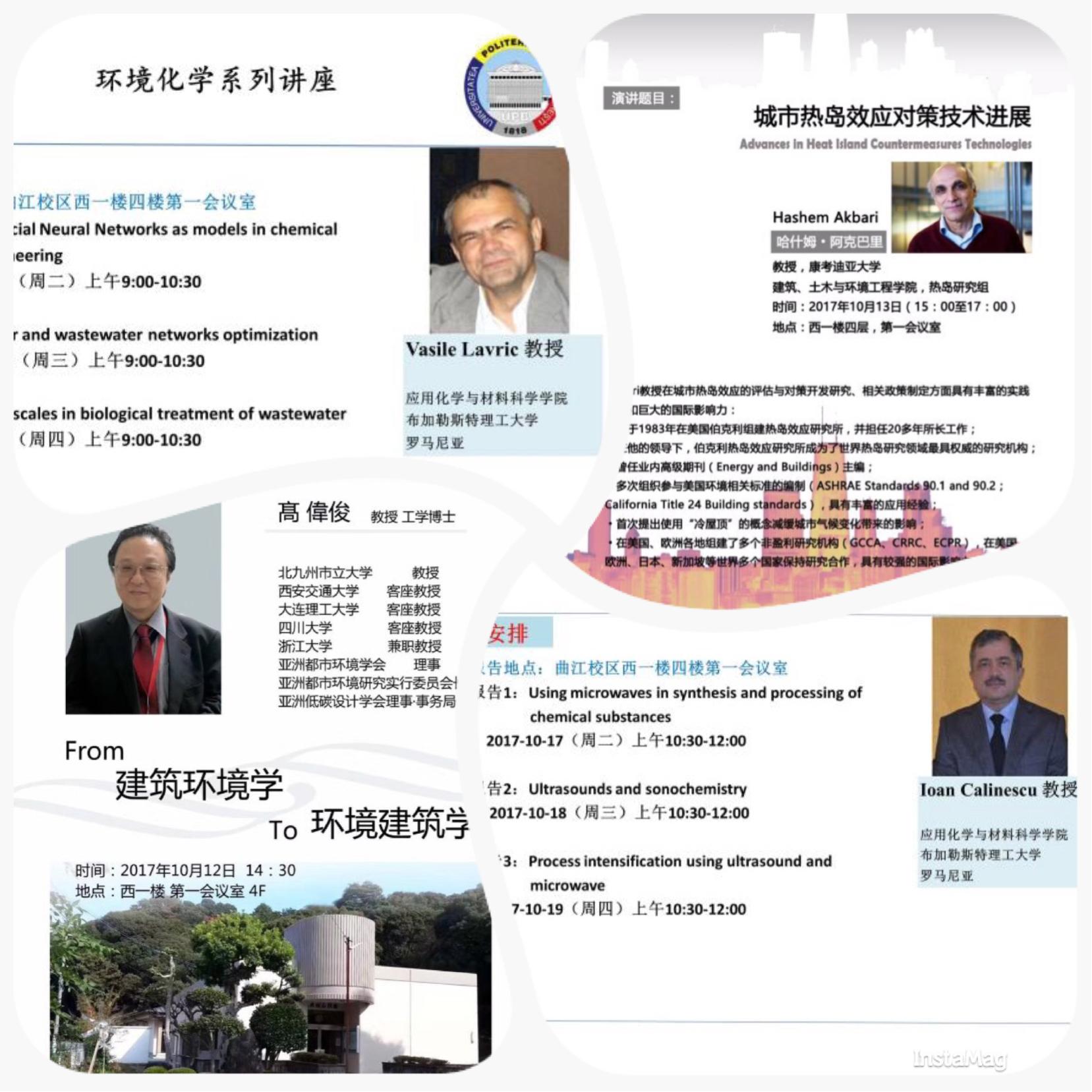 为了积极营造学院浓厚的学术和科研氛围,激励全院教师以崭新的精神姿态和奋斗姿态,迎接党的十九大的到来。10月10-10月19期间,各系所分别邀请到康考迪亚大学、北九州市立大学、日本神户大学、布加勒斯特理工大学、同济大学6位学者教授来院开展学术交流活动,为全院师生带来包括环境化学领域、建筑领域、土木工程等领域连续11场高水平学术报告会,全院师生共飨科研饕餮盛宴,全体师生很是振奋。