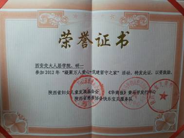 活动之后,硕2112班党支部荣获由陕西省妇女儿童发展基金会、《华商报》黄马甲发行中心及陕西省慈善协会快乐宝贝服务队联合颁发的荣誉证书。