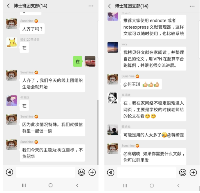 团支部13名同学利用微信在线进行科研交流和分享,会议由团支部书记吕龙龙主持。吕龙龙首先详细介绍了全国疫情发展及防控的形势,带领支部全体团员共同学习了习近平总书记关于应对新冠肺炎疫情的最新重要指示和精神。全体团员集中学习并讨论了如何听党指挥和如何贡献自己的一份力量。