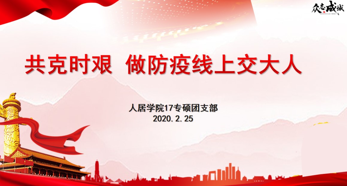 新型冠状病毒感染的肺炎疫情发生以来,全国上下众志成城,万众一心,采取各种“硬核”措施防止疫情扩散蔓延。2月25日晚8:00,人居学院2017专硕团支部开展了“共克时艰 做防疫线上交大人”主题活动。同学们通过手机和电脑等通讯设备,参与了此次会议。会议由团支书张丹宁主持,团支部副书记惠瑾毓、组织委员李媛媛记录总结。