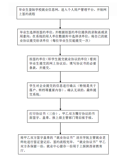 在学校就业创业中心网站完成注册的用人单位(甲方),已经在学校就业创业中心网站激活个人就业账户的毕业生(乙方),双方达成就业意向,即可进行网上签约,流程如下: