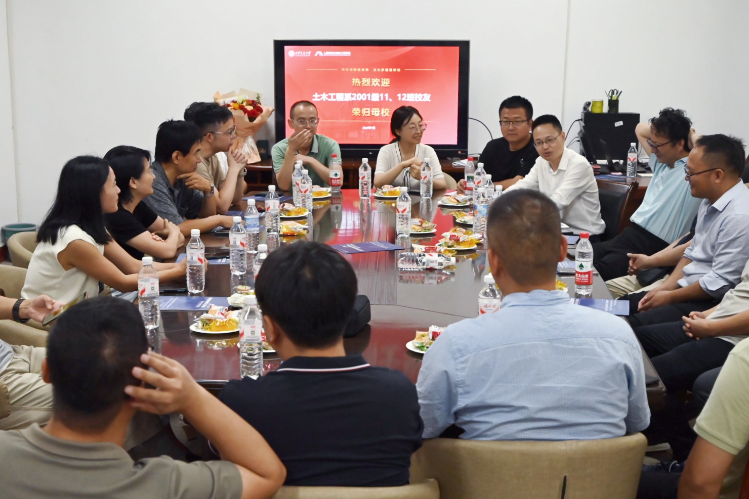 2025年7月19日, 2005届校友毕业二十周年返校活动在西安交通大学顺利举办。人居学院分会场于东二楼会议室迎来“时光之约”,开展了一场热烈的师友交流会,杨政、龙玉成、张硕英、张立、张玲玲、岳焱超、土木工程专业2001级11班与12班校友出席。