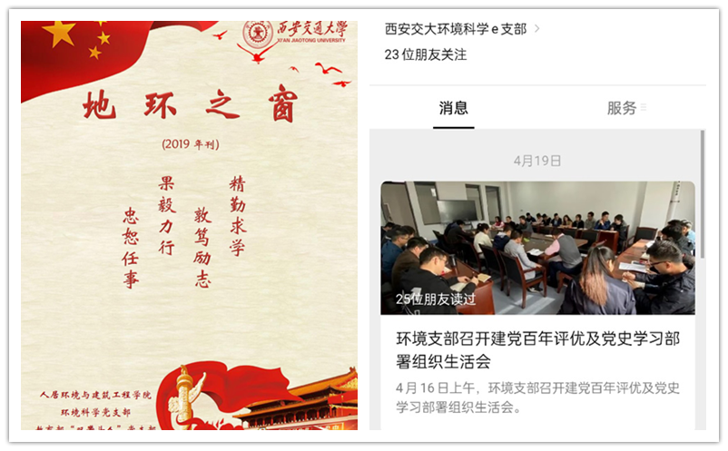 支部与时俱进、创新思路、改进方法,环境科学党支部博士生党小组参与创办“先锋支部星火讲堂”党性教育培训班,录制党课;运行“西安交大环境科学e支部”微信公众号,宣传支部党建工作;创办内部刊物《地环之窗》年刊,总结支部在党建、教学及科研等方面的亮点工作;结合专业学科特色开展“世界地球日”宣传活动;与兄弟高校、友好单位党支部展开双支部联合组织生活会。生活会内容充实饱满,在严肃活泼的氛围中提高每位同志的党性与觉悟,在开展主题党日过程中,支部重视与广大师生的联系,发动团员、群众广泛参与,取得了良好反响。