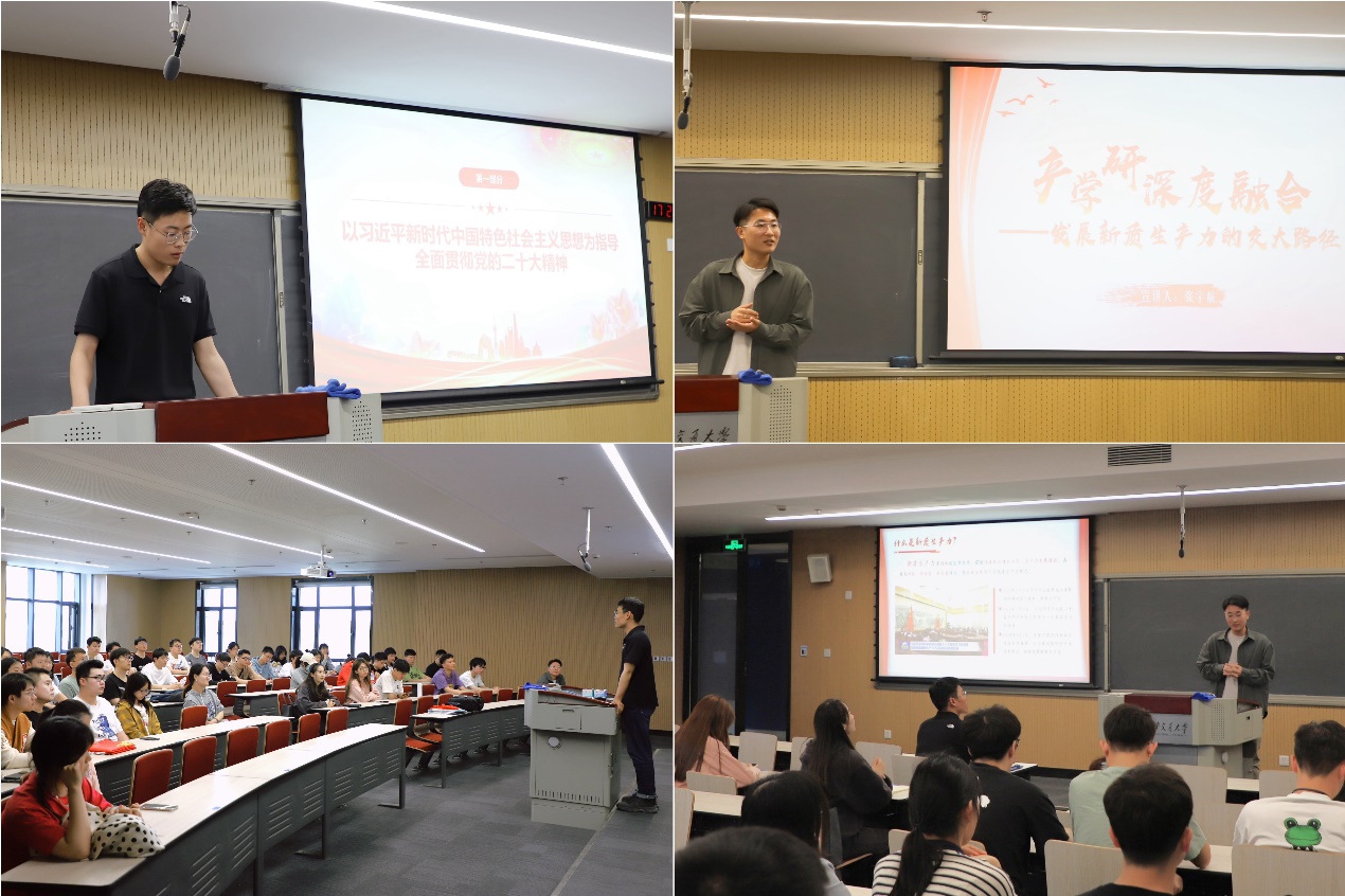 校宣讲团成员、学院兼职辅导员张宇航以“产学研深度融合——发展新质生产力的交大路径”为题,从“是什么、为什么、怎么做”三个篇章切入,阐释了新质生产力的基本内涵、核心标志、特点、关键、本质,并结合学校“6352”工程、“1121”产学研深度融合新模式的中心工作,讲述了交大在发展新质生产力方面的探索和成果。薛同宣讲授“以严守党纪正心正身 以锤炼党性律己律行”专题党课,带领大家全面学习了《中国共产党纪律处分条例》,并号召广大青年以此次党纪学习教育为契机,磨砺党性、锤炼品格,“认真学《条例》、深刻悟原理、实干建新功”,为党和国家事业发展作出新的更大贡献。