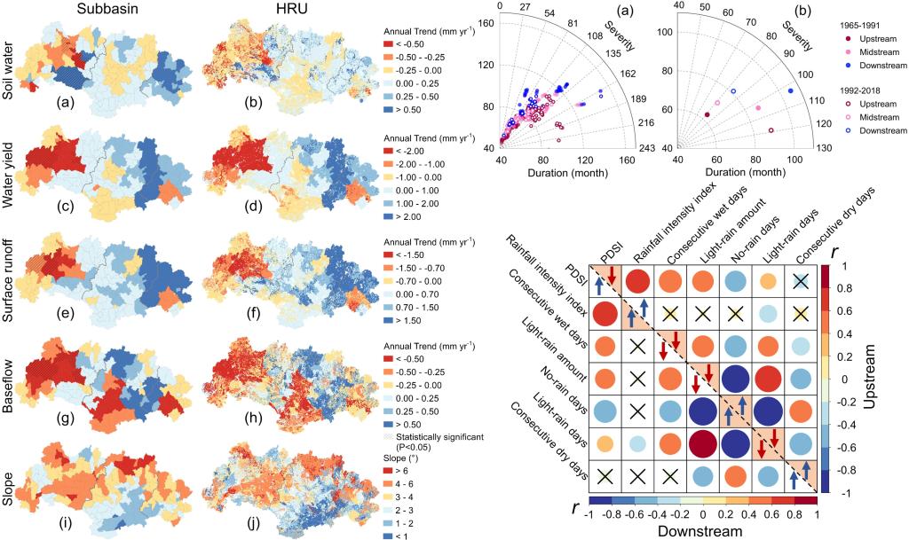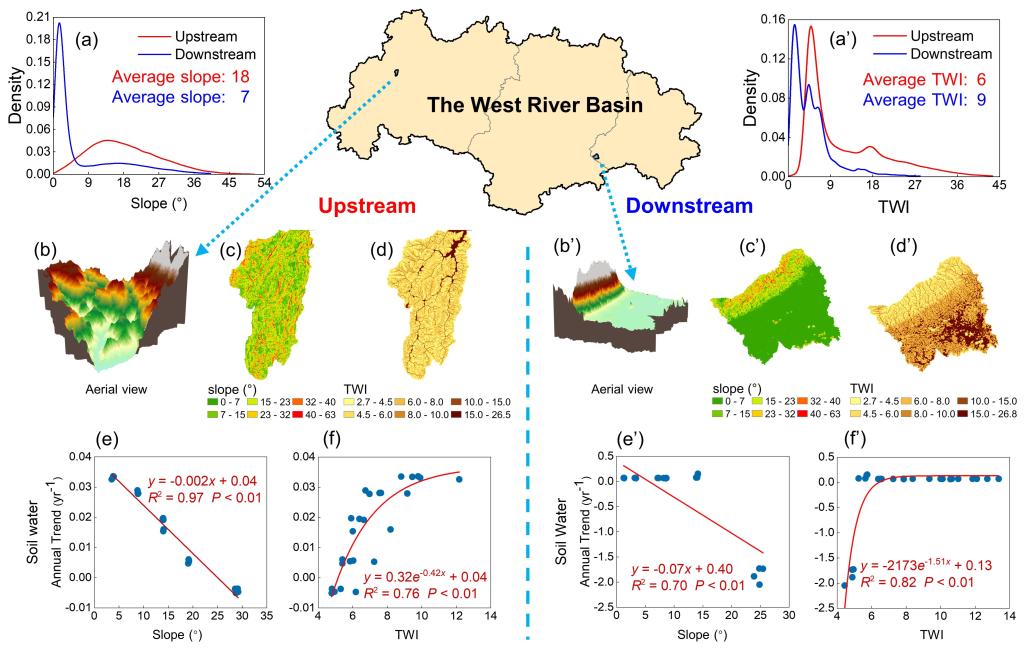 科研团队再通过一系列模拟试验深入解析了降水模式变化下不同尺度(坡面、水文响应单元、子流域及区域)的水文响应机制。研究表明上下游地区的两个典型小流域的水文响应存在共性:高坡度地区变得更加干燥,而低坡度地区则变得更加湿润。由于西江流域上下游地形差异显著—上游高地较多,总体较为陡峭,而下游低地较多,总体较为平缓。因此,上游地区以变干效应为主,下游地区以变湿效应为主,从而揭示了降水增强和地形差异共同导致西江流域上下游地区两种截然相反的水文效应。