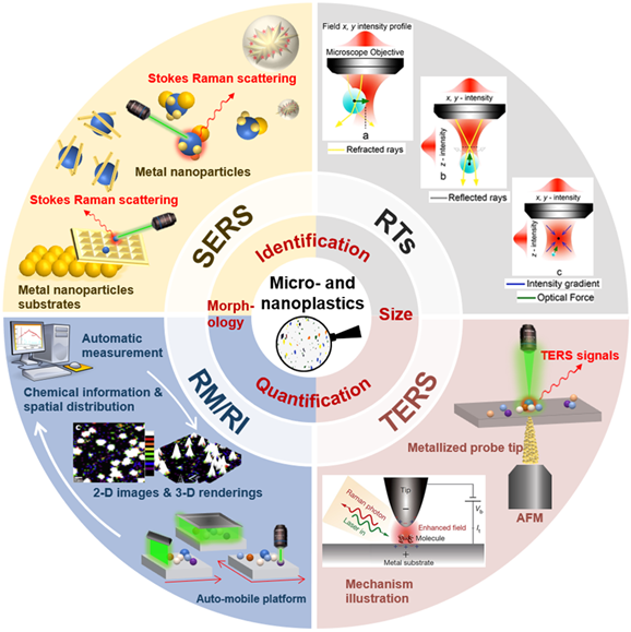 图1. 表面增强拉曼散射(SERS)、拉曼镊子(RTs)、尖端增强拉曼散射(TERS)以及拉曼显微成像(RM/RI)用于微纳塑料的检测模式和原理