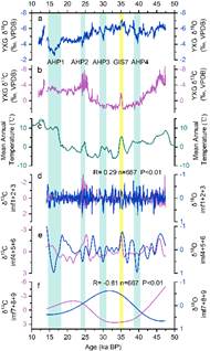 图2石笋YXG01 δ18O (a)和δ13C (b)记录与大九湖孢粉记录重建的年平均温度记录(c) (Xiao et al., 2015)的对比,详细解释请见正文。