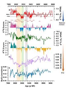研究结果表明,中国东南地区的 8.2 ka 事件始于 8.24 ± 0.02 ka B.P.,结束于 8.03 ± 0.03 ka B.P.,中心事件发生于8.22-8.14 ka B.P.,持续时间约80年(图2)。SN31δ¹⁸O记录显示EASM强度显著减弱,结合SN31δ¹³C、微量元素及生长速率,认为夏季风强度的减弱导致研究区气候干旱,这与4.2 ka弱季风事件期间该地区为湿润气候具有显著差异(Zhang et al., 2018; Zhang et al., 2021)。多指标记录(δ¹³C与微量元素)分析表明,中国东南地区8.2 ka事件的“前兆事件”发生于 8.35-8.29 ka B.P.,并且在该事件期间研究区水文气候状况呈现干旱状态。